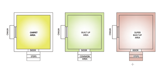 As per the Real Estate Regulatory Authority (RERA), the carpet area and built-up area are added up to be known as super build-up areas along with common areas such as stairs, lobbies, and others.